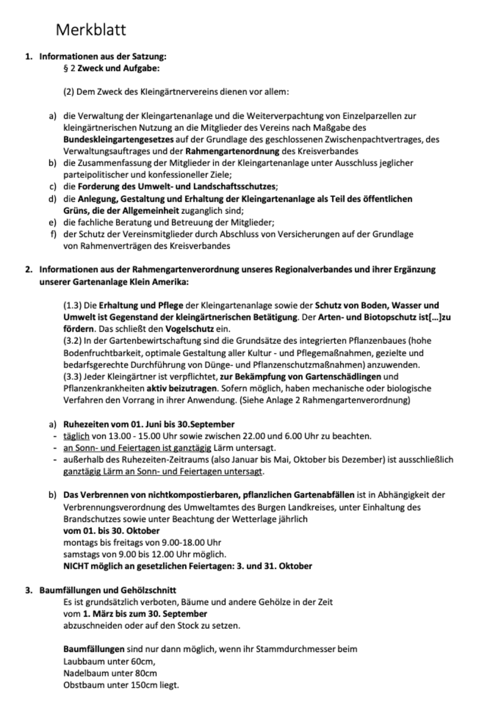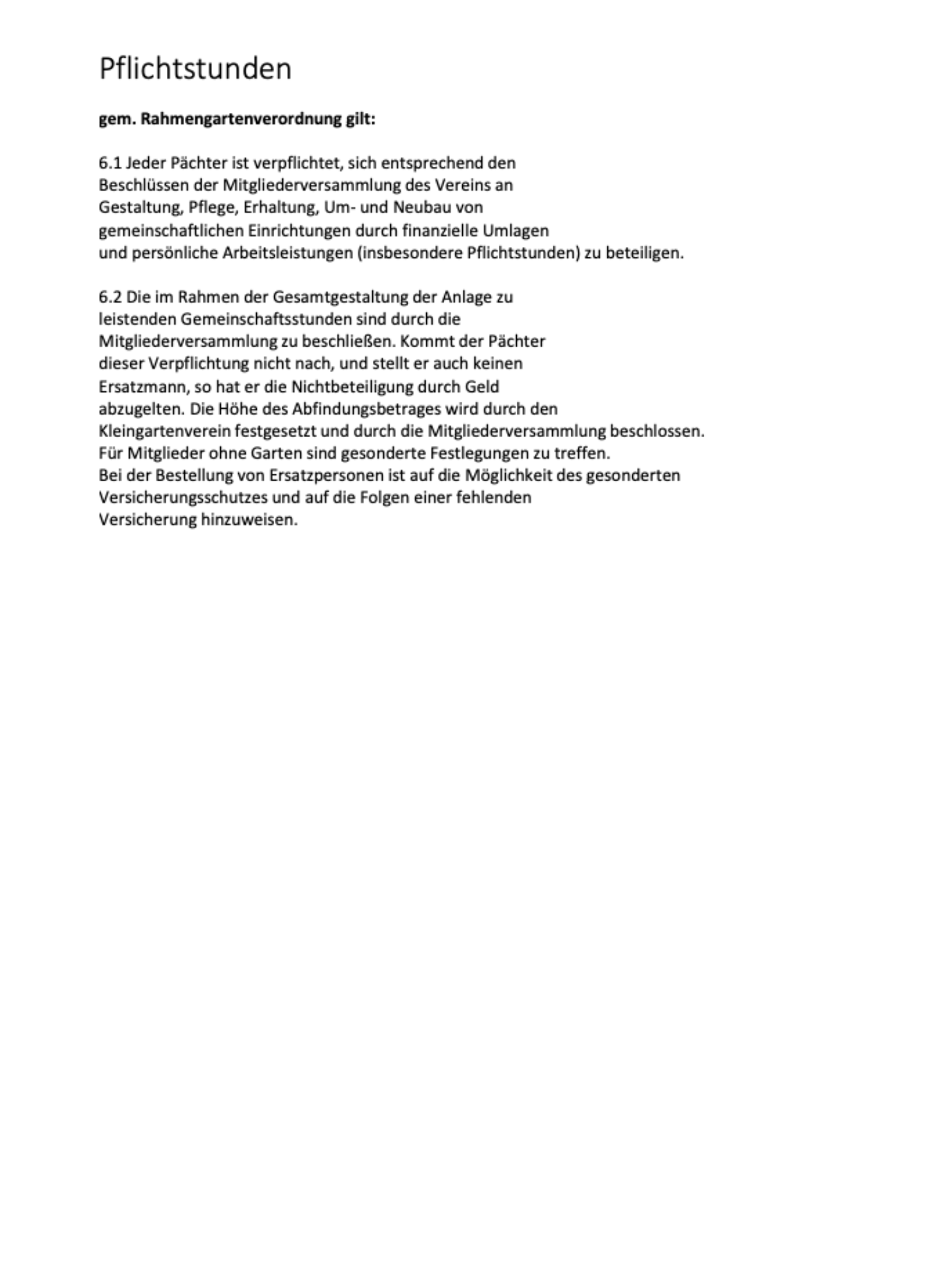Als gemeinnütziger Verein sind Zweck und Aufgaben in unserer Satzung festgeschrieben. Die Verwaltung der Kleingartenanlage und die Weiterverpachtung von Einzelparzellen zur kleingärtnerischen Nutzung an die Mitglieder des Vereins nach Maßgabe des Bundeskleingartengesetzes (BKleinG) ist ein Beispiel dafür. Unser gemeinnütziger Vereinszweck beruht auf Grundlage des Verwaltungsauftrages und der Rahmengartenordnung (RO) des Kreisverbandes sowie der ergänzenden Rahmengartenordnung (Ergänzung-RO).